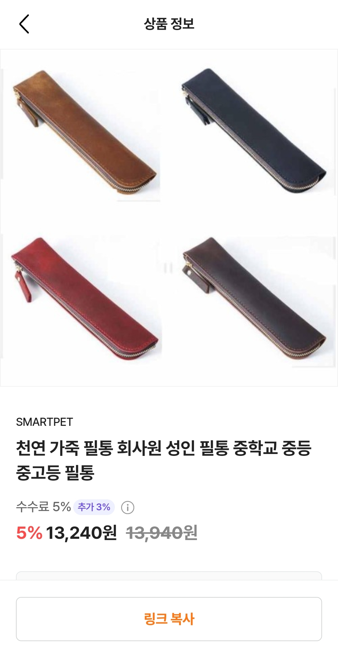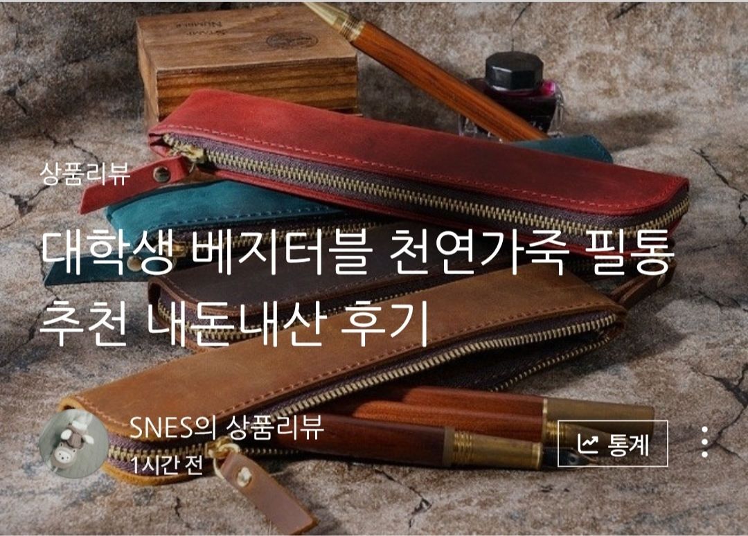 제가 네이버 플러스 스토어에서 구매했던 천연가죽 필통 제품이 쇼핑 커넥트에 있습니다. 저의 홍보를 통해 저 필통을 구매하게 된다면, 5%의 수수료를 벌 수 있다는 이야기죠. 하단에 링크 복사 버튼을 눌러 내 블로그에 붙여넣기 하고 클릭을 유도하면 됩니다.
