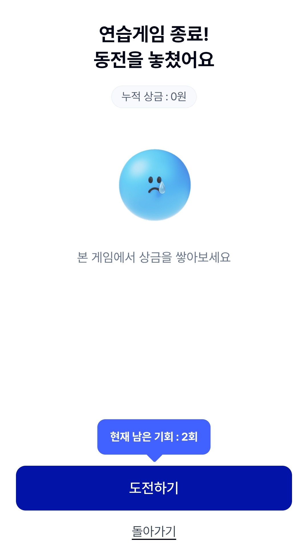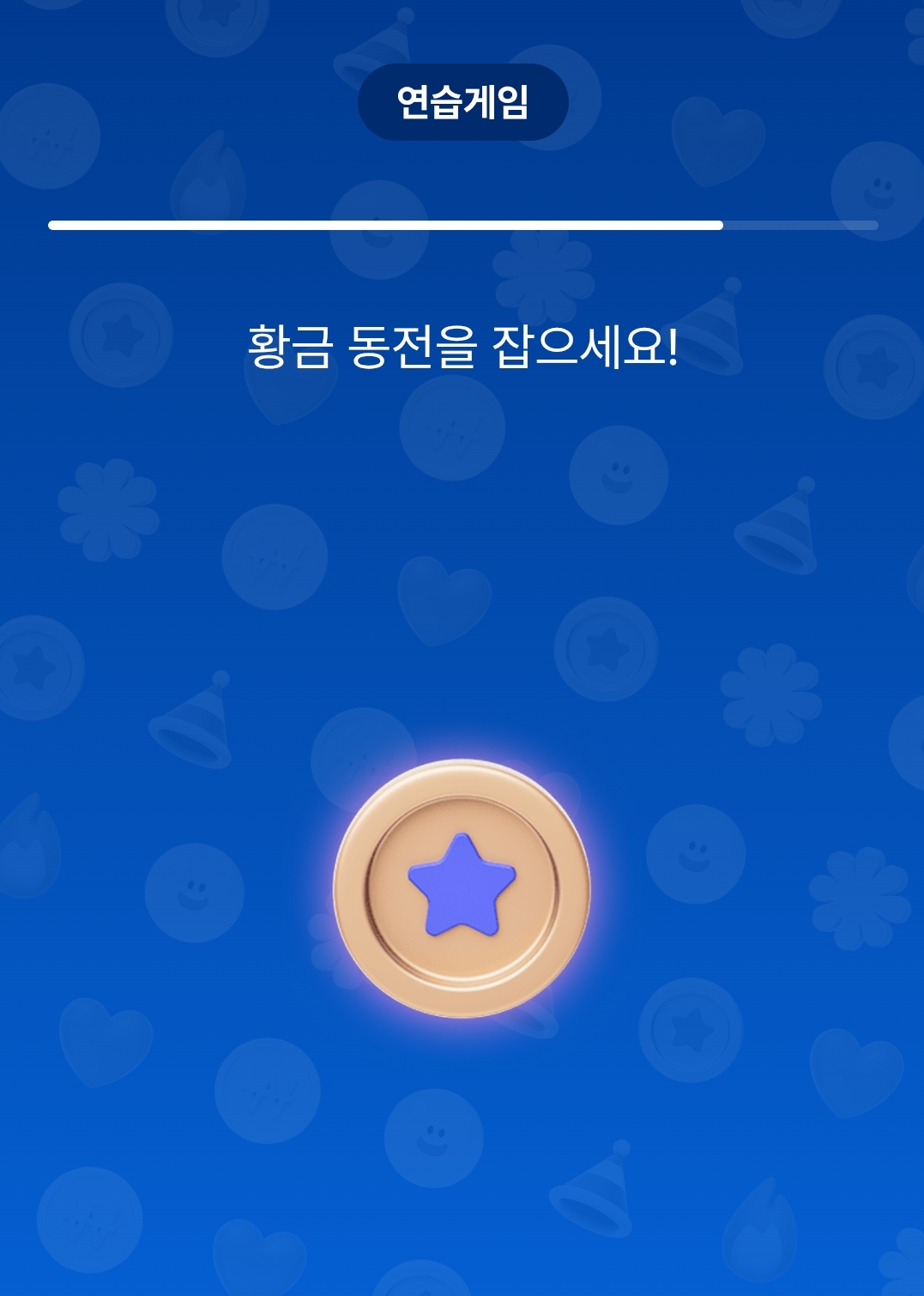 처음에는 연습게임을 시켜줍니다. 위 사진과 같이 황금동전이 나오면, 황금동전을 터치하면 되는 간단한 게임^^
