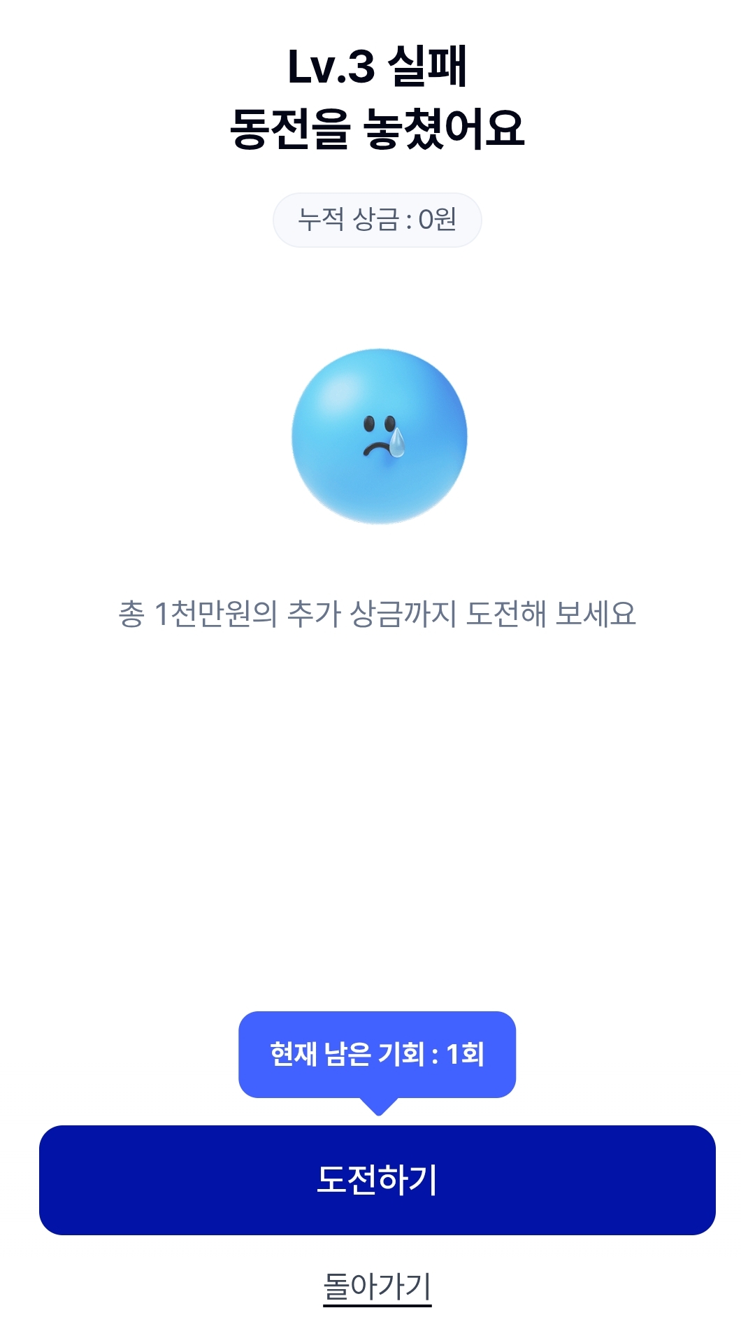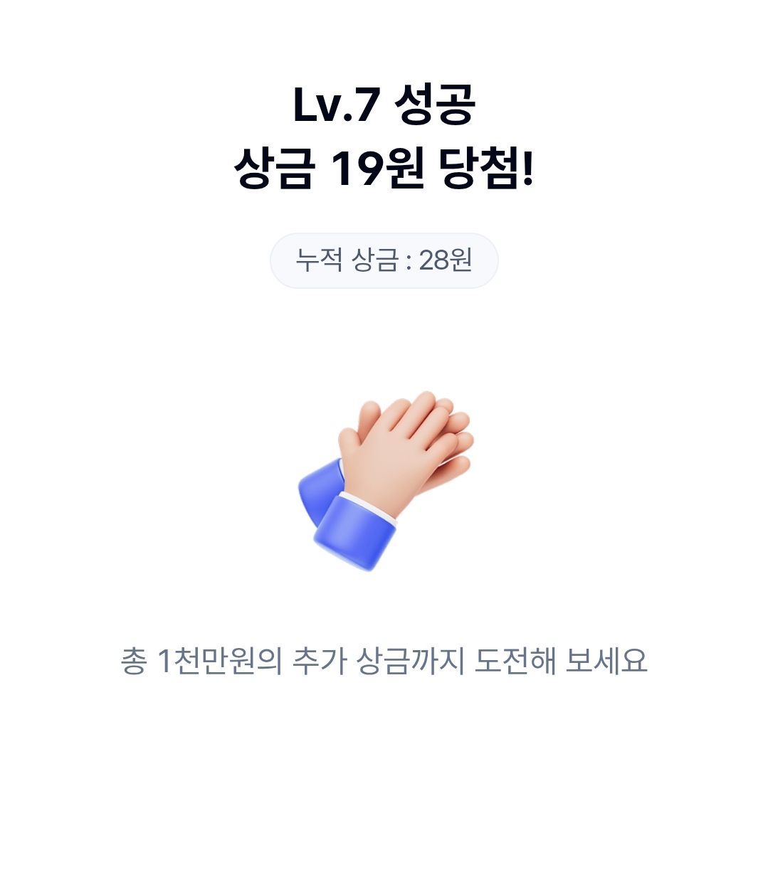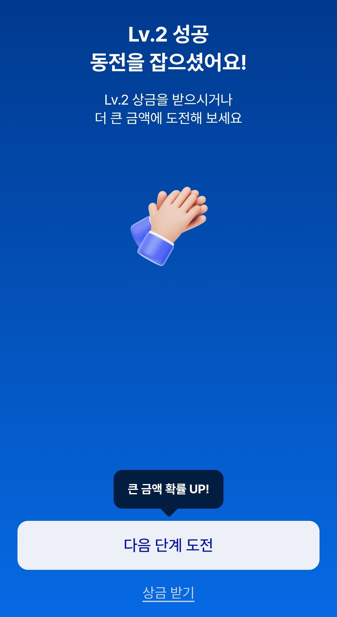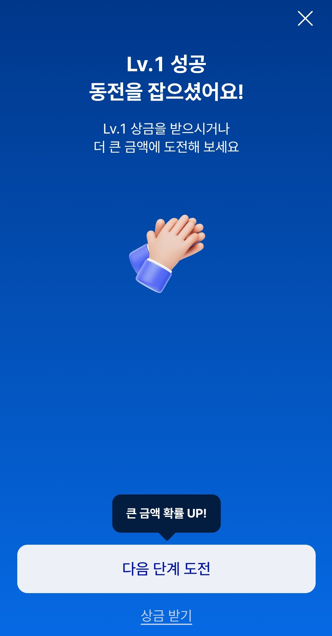 LV. 1단계 성공했더니 이런 화면이 나옵니다. 다음 단계를 계속 클리어해 나갈수록 큰 금액이 나올 확률 또한 UP 된다고 하네요.