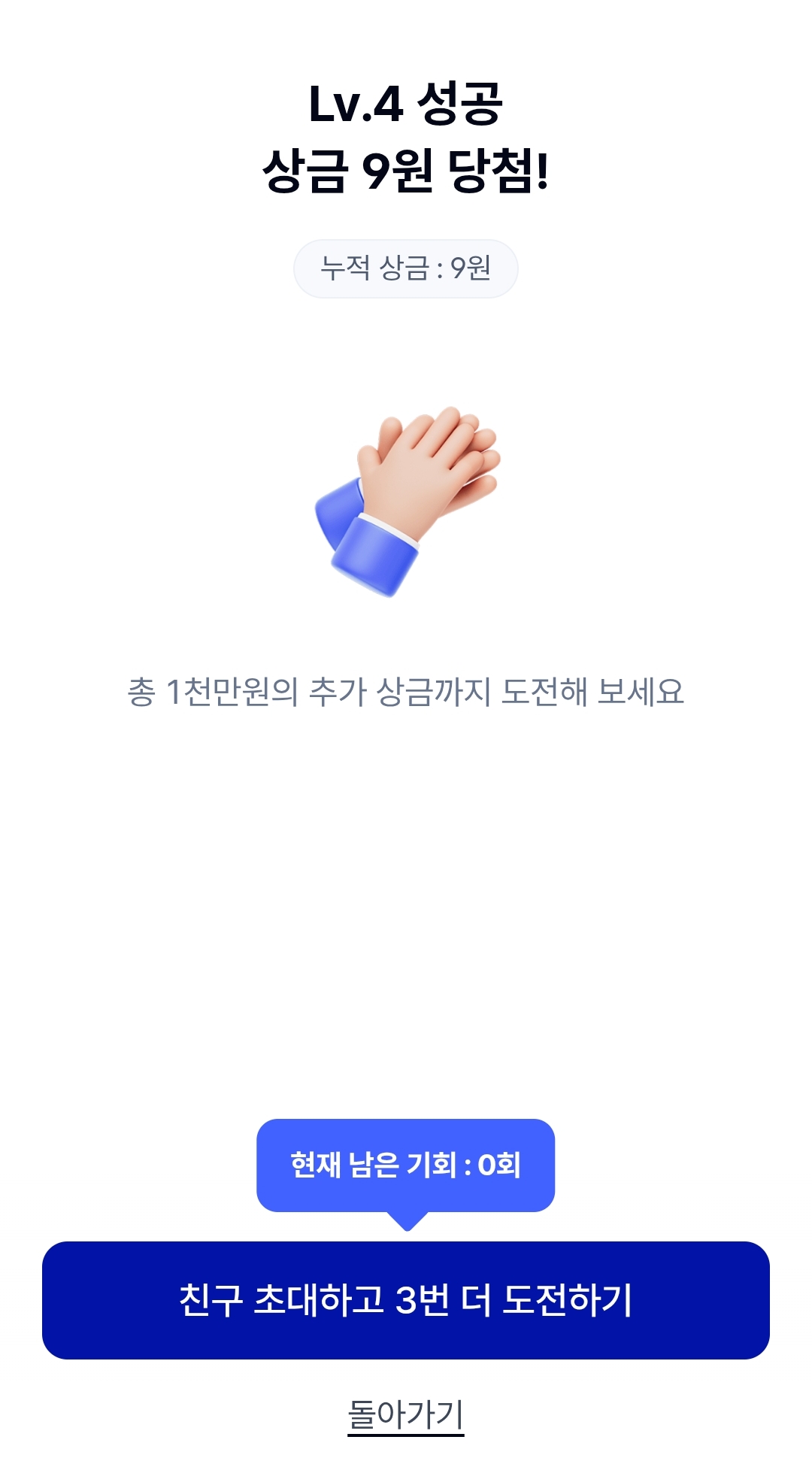 실패 후 다시 케이뱅크 동전던지기를 해서 LV. 4 단계에서 도전 그만하고 상금을 받았습니다. 9원 당첨이네요~