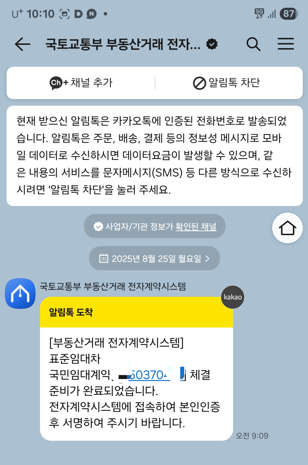위 문자 내용이 설명하고 있는 국토교통부에서 관리하는 부동산 전자계약 시스템에서 카카오톡이 하나 날라왔습니다.