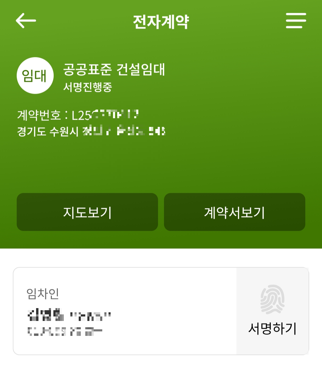 부동산 전자계약 앱에 들어가보니, 벌써 LH 국민임대 계약서가 도착했습니다. 공공표준 건설임대 서명 진행중이라고 보이시죠? 하단에 있는 서명하기 버튼을 눌러 서명을 해줍니다.