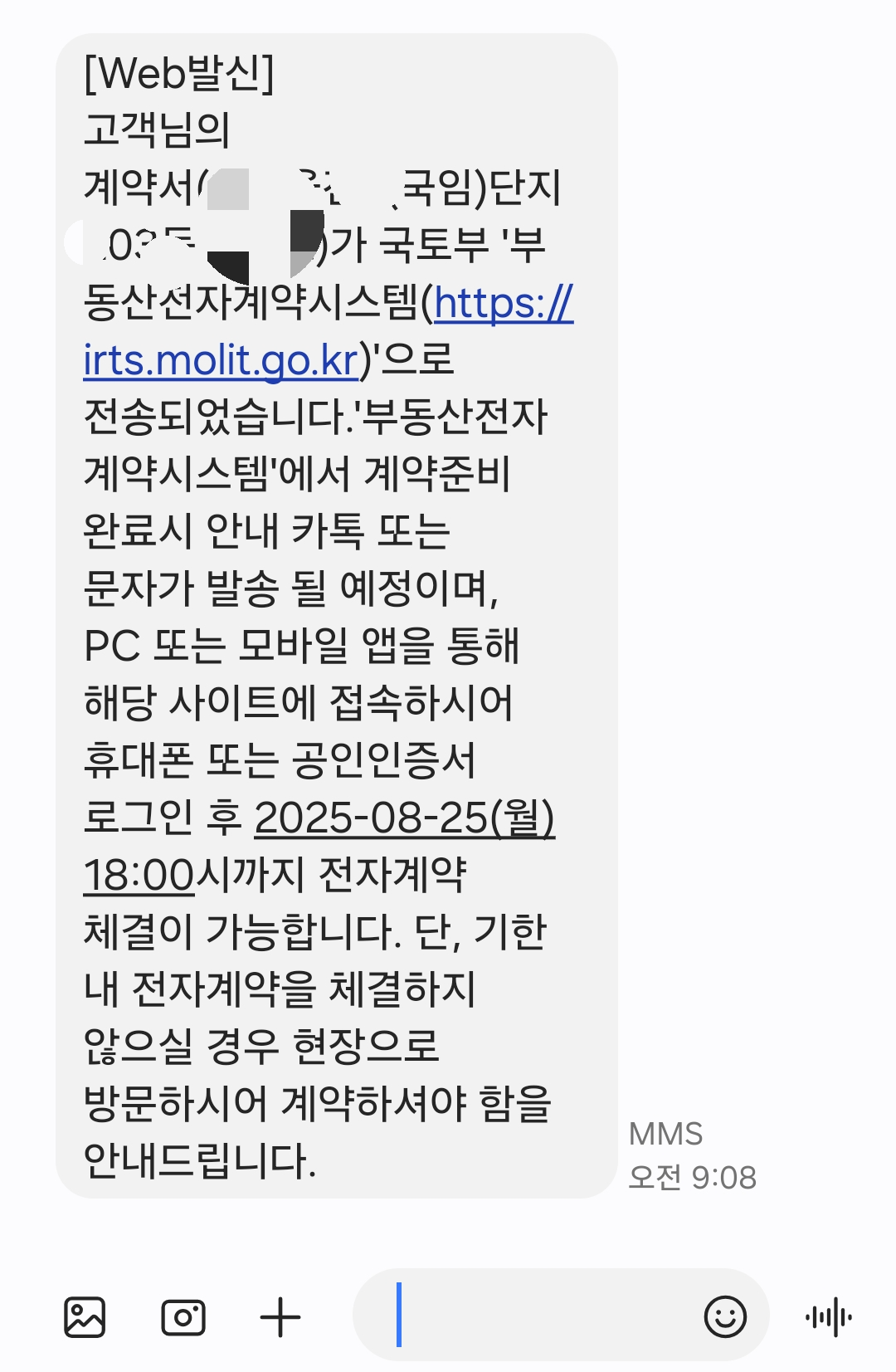 계약 당일이 되자, 위와 같은 내용의 문자가 발송되었습니다. 계약일 당일 오전 10시부터 오후 6시까지만 계약할 수 있으니 반드시 시간 맞추어 계약하시길 바랍니다.